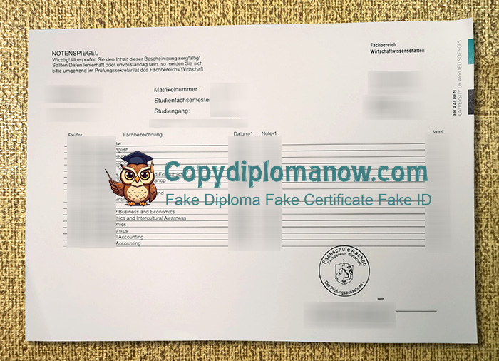 Sell a FH Aachen – University of Applied Sciences Transcript, FH Aachen Transcript, Fachhochschule Aachen Zeugnis, Die FH Aachen gehört zu den größten Fachhochschulen in Deutschland. Aktuell sind dort über 14.050 Studenten eingeschrieben und rund 230 Professoren tätig. Über 150 Partnerhochschulen befinden sich im internationalen Netzwerk der Fachhochschule Aachen sowohl innerhalb als auch außerhalb Europas. Die FH Aachen gliedert sich in die folgenden 10 Fachbereiche: